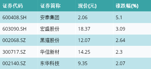 截至收盘,煤化工主题涨跌幅最高的五只股票为:安泰集团(600408.SH)、宏盛股份(603090.SH)、黑猫股份(002068.SZ)、华信新材(300717.SZ)与东华科技(002140.SZ)。详情见下表: